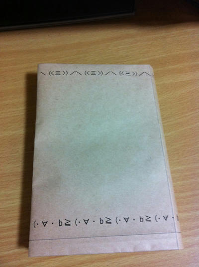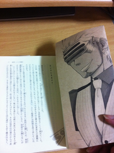 逆裁既刊全種・デュラ本全種・ワンピのヒデローちゃんの本がちょっとだけあったので持って行く予定です。ヒデローちゃんの本は逆裁のもあるよ! ちなみに私明日ちょっと早く上がる予定(13時半頃には帰ります)なのですが宜しくお願いします゚.:。+゚ヽ(<三>)ノ゚.+:。゜ 明日のスパコミ、新刊は無いんですが、ブックカバーとペーパー無配してます、特に既刊のご購入が無くても、こんなんで良ければ差し上げますので、スペに遊びに来てくださいね。 ブックカバーの見本。こんなん作りました。 被せてみた感じ。 折り返しのとこ。本が思い切りハルヒですが。てへ クラフト紙可愛いっしょ。顔文字が表に来るのはちょっと…と云う場合は裏返して使ってください。クラフト紙なので透けないのだ。素晴らしい!自分で云った! 文庫版と新書版で用意したんですが、紙自体はB4なので、折ってない分ならご自分で本のサイズに合せて折って貰えればA5の本までならイケます。A5で合わせたい場合は手前の折込のゴドーさんの部分だけ折った分でお渡ししますので仰ってください。新書用(兼A5)と文庫版用、それぞれ30枚ずつだけなんで、まあ充分足りると思いますが、無くなり次第終了です。裁きのときにはスパで残った分と、また余分に刷って持って行きますヾ(<三>)ノ♪ 新刊ないの寂しいなあ。新刊無いイベはこれで二度目ですえぐ…。裁きにはコピー本間に合えばいいんだけどな。と云うのは昨日も云いましたけども。そんな感じで明日お会いできたら! PR この記事にコメントする